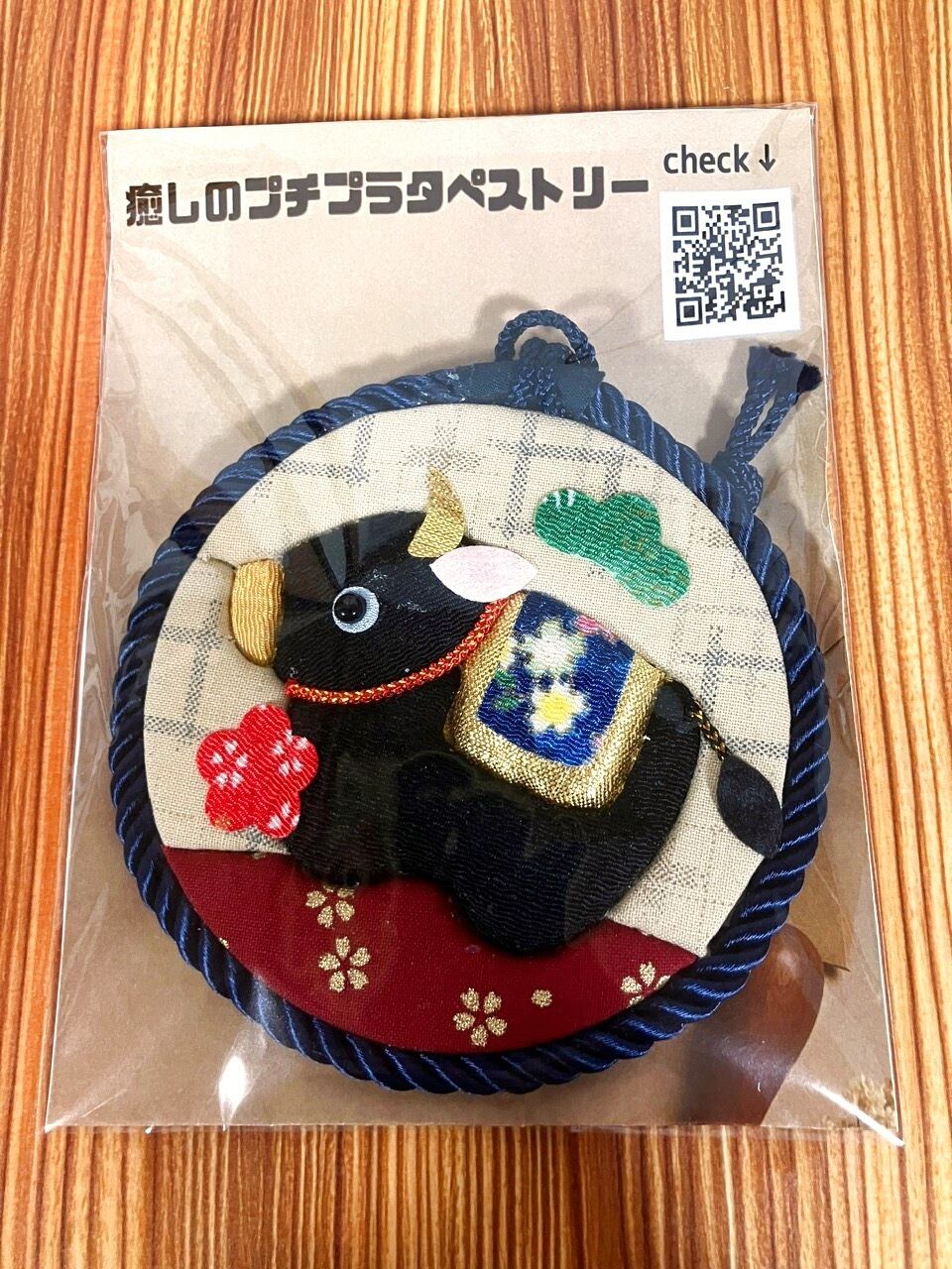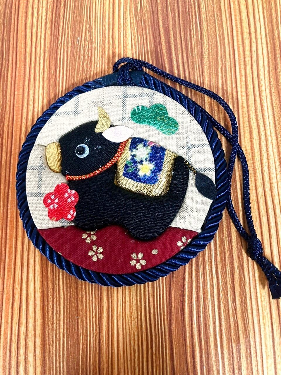 ころんと可愛い、きめこみ細工の和風プチタペストリーです。落ち着きのある黒牛をモチーフに、華やかな和柄の背飾りを合わせた上品なデザイン。