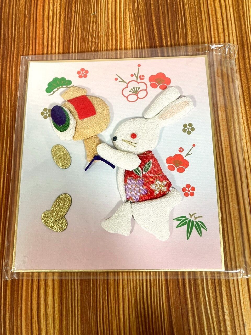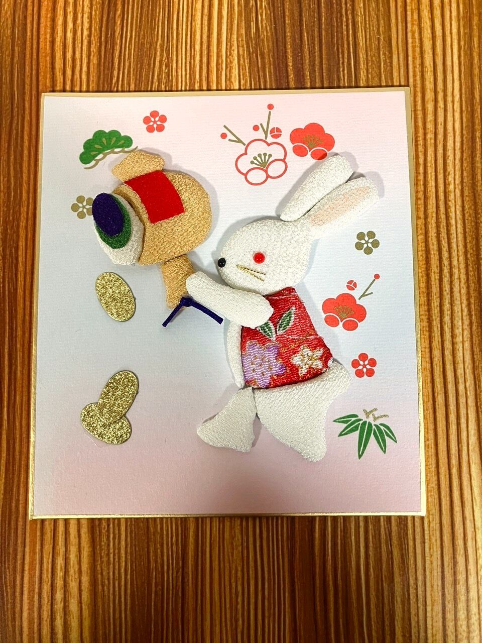 華やかな和柄ちりめんを使用した、卯(うさぎ)の押絵色紙です。立体感のある仕上がりで、打ち出の小槌を持つ、うさぎが印象的な一枚です。